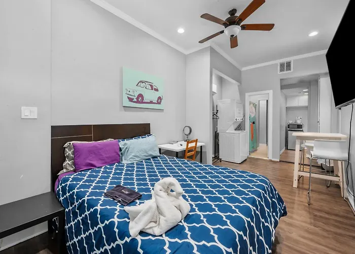 **Welcome to the Modern & Chic Montrose Studio - a delightful retreat nestled in the eclectic neighborhood of Montrose, Houston, celebrated for its vibrant culture and diverse culinary scene.** This stylish studio embodies a perfect fusion of comfort and modern aesthetics, making it an ideal sanctuary for travelers seeking both leisure and adventure. You will find yourself immersed in an area rich in gay bars, vintage boutiques, and a culinary landscape that showcases everything from cozy cafes to tantalizing Mexican and Mediterranean eateries.